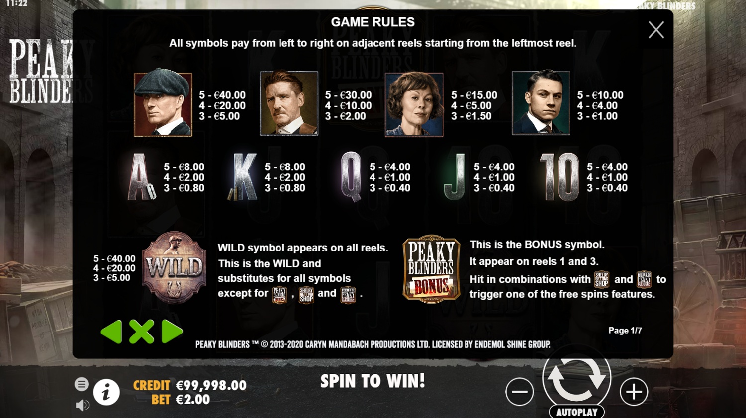 Минимальная ставка в Peaky Blinders™ варьируется в зависимости от выбранного вами казино. Проверьте информацию на сайте казино, где вы играете.